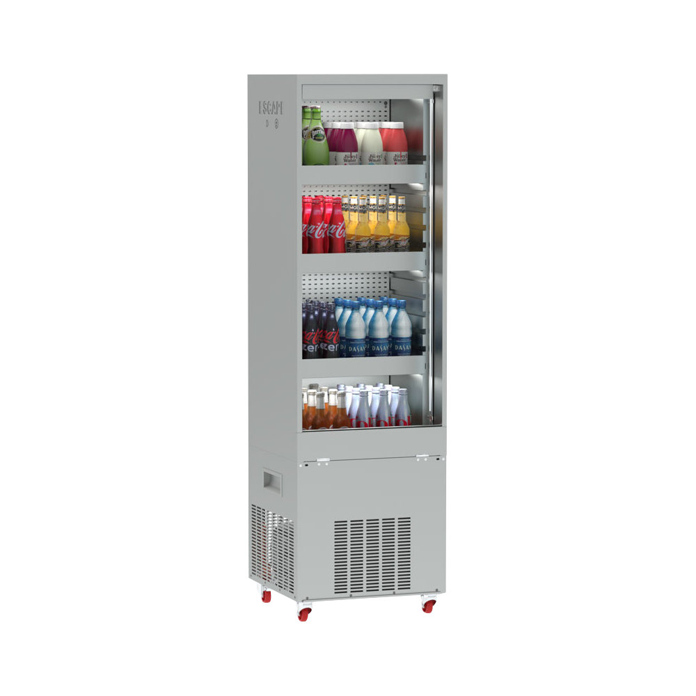 L'ESCAPE PT est un équipement nomade, qui peut être facilement déplacé, conçu pour être monté et démonté sans outils. En tant que point de vente, conçu pour des opérations promotionnelles éphémères, le ESCAPE PT permet une l'insertion simple de la PLV.Avec 3 étagères amovibles et ajustables et son éclairage vertical, le ESCAPE PT promet d'être le meilleur instrument pour les achats d'impulsion de tout type d' établissement. La mobilité est assurée grâce au trolley fixé au groupe de réfrigération et aux roulettes à freins.
